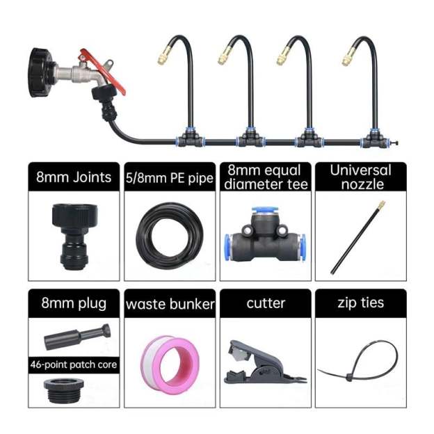 This kit includes 49.2 feet of 8mm pressure-resistant hose, 15 360° adjustable brass spray heads, 12 sets of leak-proof tee connectors, and is equipped with quick connectors, 1/2-inch and 3/4-inch dual-specification faucet adapters, pipe cutters and fixed cable ties. All accessories are carefully matched to meet the needs of multi-node expansion, free cutting and stable installation, without the need for additional purchases.